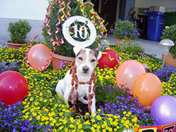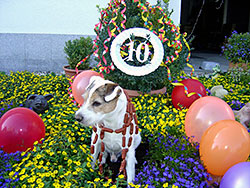 Nawuff, und da ich heute meinen 10. B U R Z E L T A G feiere, durfte ich das erstemal in Frauchens Blütenmeer sitzen, für ein paar Bildchen zum Andenken an meinen