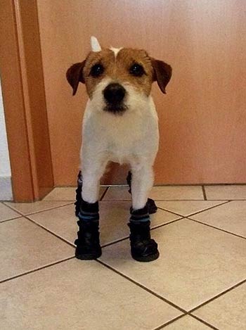Pfotenschuhe tragen, damit sich meine Pfoten nicht mehr verletzen.