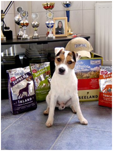 Ich habe ein eigenes großes Spielzimmer, in dem sich mittlerweile auch meine hart erkämpften Show-Pokale und Urkunden befinden. Die Wände habe ich mit vielen lustigen Bildern und Postern meiner Freundolino´s zum Andenken "eigenpfotig"