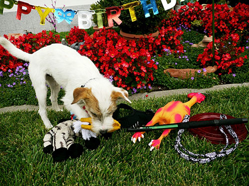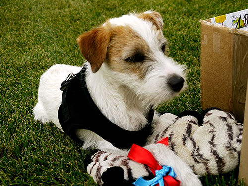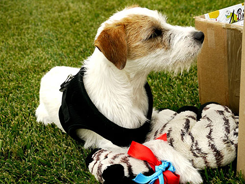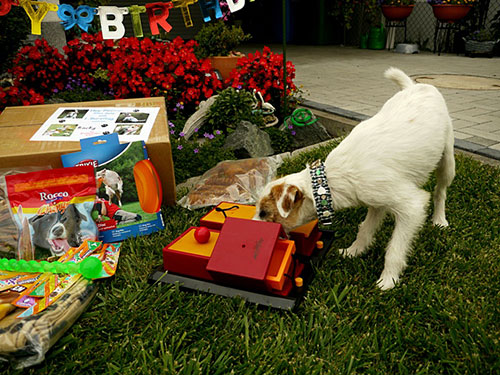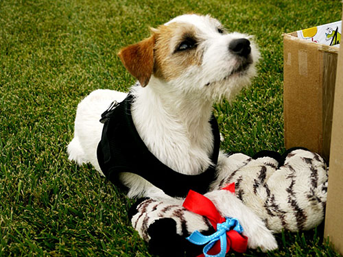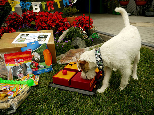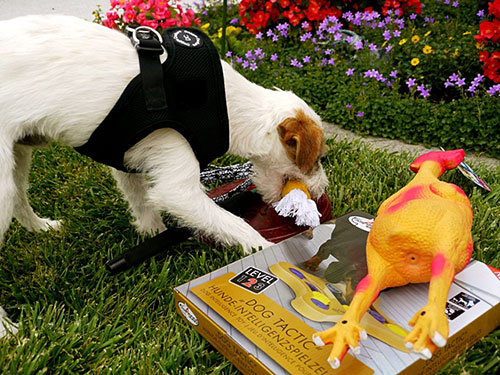 Wuff, was mag wohl in dem bunten Päckchen versteckt sein ?
