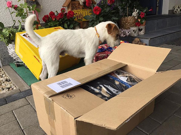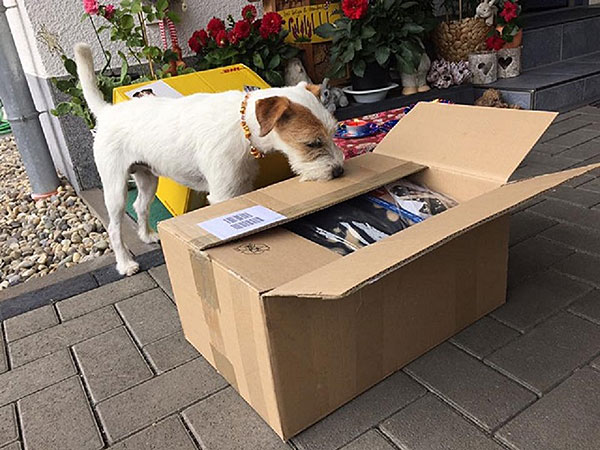 Wuff, als ich dann endlich die geheimnisvolle Kiste zwischen meine Pfötchen bekam, hab´ ich ganz vorsichtig die Paketnaht mit dem rechten Pfotenkralli aufgeschlitzt um bloß nix kaputto zu machen..