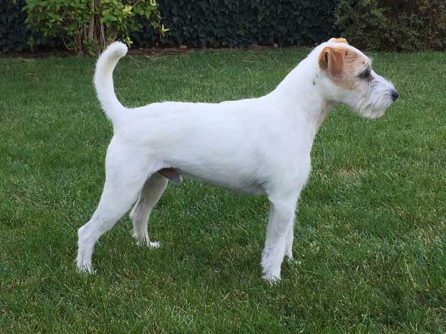 Harmonisch aufgebauter aber sehr zierlicher Rüde, ansprechender Kopf mit dunkelbraunen Augen. Korrekt getragene Ohren.