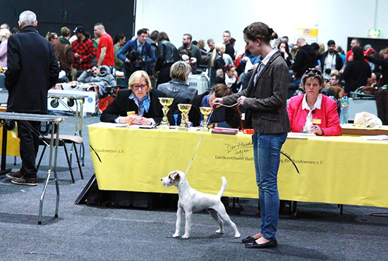 Piccolo „Elvis Costello vom Hasenbühl“ Seit geraumer Zeit besuchen wir Spezialausstellungen für Terrier - sowie Nationale und Internationale Rassehunde-Ausstellungen um den Standard unseres Parson bewerten zu lassen.Jedoch haben wir nicht vor, jedes Wochenende am Ausstellungsring zu verbringen, da es für uns und unseren Piccolo noch viele andere schöne Momente und Unternehmungen gibt, als Stundenweise mit Unterbrechungen in der Box eingesperrt zu bleiben.So haben wir am 15.März 2015 die 28. Ortenau-Schau - CACIB in Offenburg besucht, wo auch die Züchterin von Piccolo mit seiner Mama Penny „Artemis vom Hasenbühl“ anwesend war, die in der Gebrauchshunde-Klasse ausgestellt wurde.Natürlich gab es ein freudiges wiedersehen zwischen Züchter und Besitzer, sowie